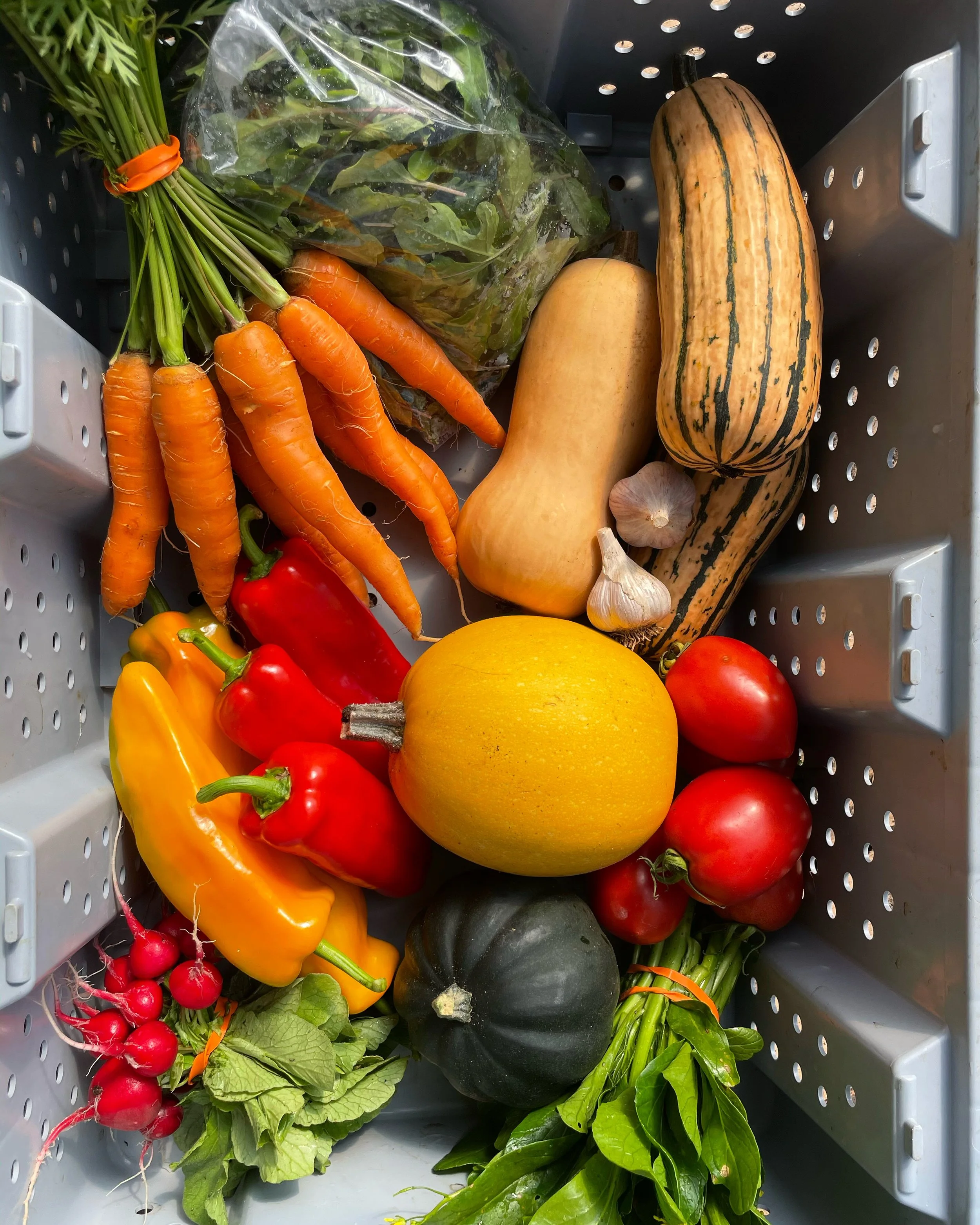 One of our biggest and brightest shares gave our members the chance to store some squash for winter. And snack on our favorite crop: sweet peppers. Also, if you haven’t tried choy sum, it is amazing.